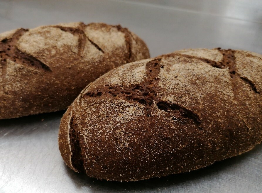 3 мин 1 скорость + 5 мин на 2 скорости 10 мин 650 гр 5 мин Батон, слегка обвалять в смеси муки ржаной обдирной и отрубей ржаных (1:1) 45 мин при Т 35 °С и W 75% + 10 мин в условиях цеха. Посадочная Т 230°С, основная Т 200-210°С в течении 50 мин, пар. Перед выпечкой – 5 надрезов крест- накрест.