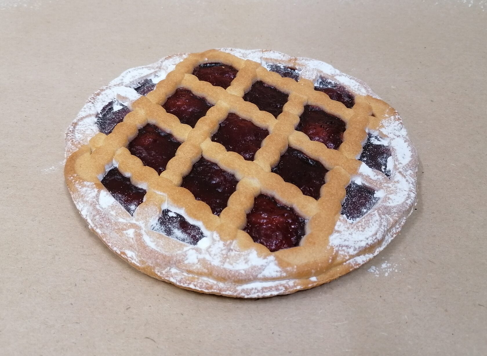 взбить сахар, яйцо и маргарин до однородной массы. Добавить воду, взбить, затем перемешать с оставшимися ингредиентами. раскатать тесто до толщены 0.5 см, вырезать круг, выложить в форму, распределить начинку, украсить полосками из теста. Посадочная Т 200°С, основная Т 160°С в течение 23 минут.