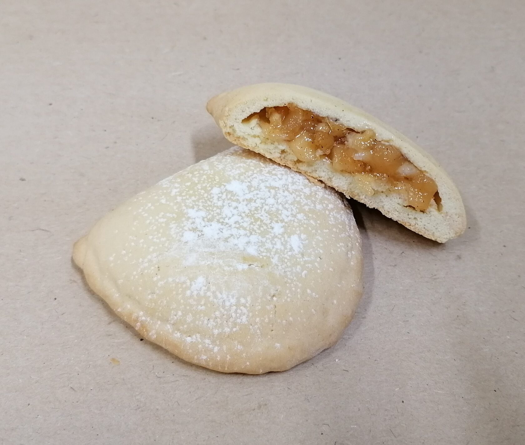 взбить сахар, яйцо и маргарин до однородной массы. Добавить воду, взбить массу, затем перемешать с оставшимися ингредиентами. раскатать тесто до толщены 0.5 см, вырезать овал, выложить начинку, сложить тесто пополам Посадочная Т 200°С, основная Т 160°С в течение 12 мин